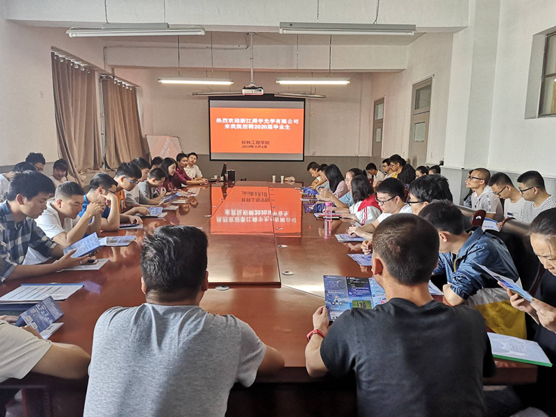 2019年9月6日早上10:10,浙江舜宇光学有限公司来我院招聘2020届材料 类毕业生,60余名应届毕业生参加招聘会,学院党委副书记、副院长陈玉梅主 持招聘会。 本次招聘会由浙江舜宇光学有限公司人力资源部兰州招聘组组员李军同志 向在场同学放映了公司视频宣传片,并向同学们简单介绍了公司规章制度、福 利待遇、企业文化等。现场解答了同学们的疑问,真诚地邀请我院毕业生到浙 江舜宇光学有限公司工作,实现自己的人生理想! 宣讲结束后,参加招聘会的同学通过现场和网络的方式投递简历,同学们 整装待发,准备参加明天面试。