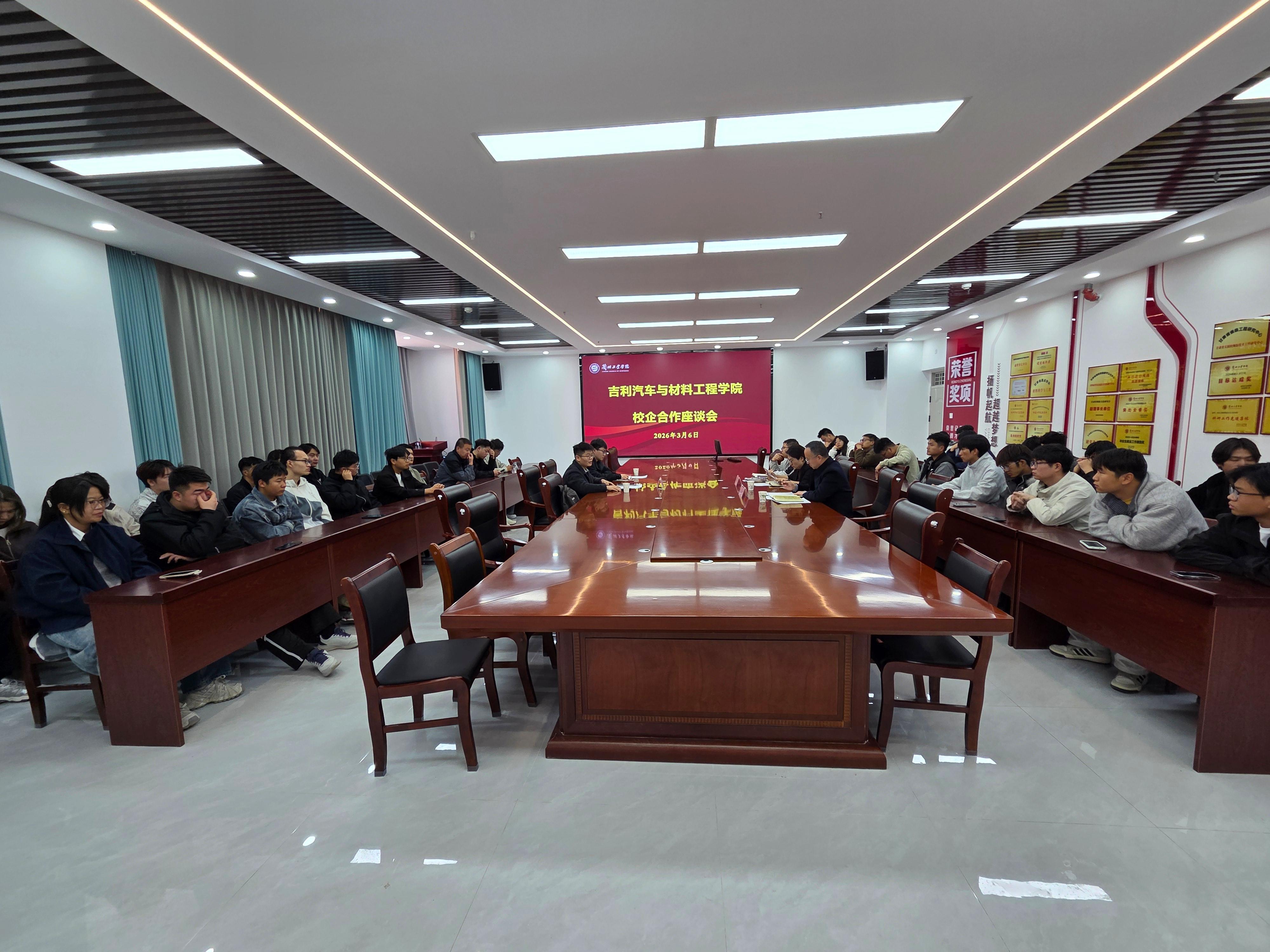 3月6日上午,吉利汽车集团与材料工程学院校企合作座谈暨专场招聘会在学院会议室举行。吉利汽车校企合作大区主管王凯应邀来校洽谈校企合作业务。学院党委书记李雯娟、院长岳武出席,学院2026届部分毕业生、院办、学工办相关负责同志参加。