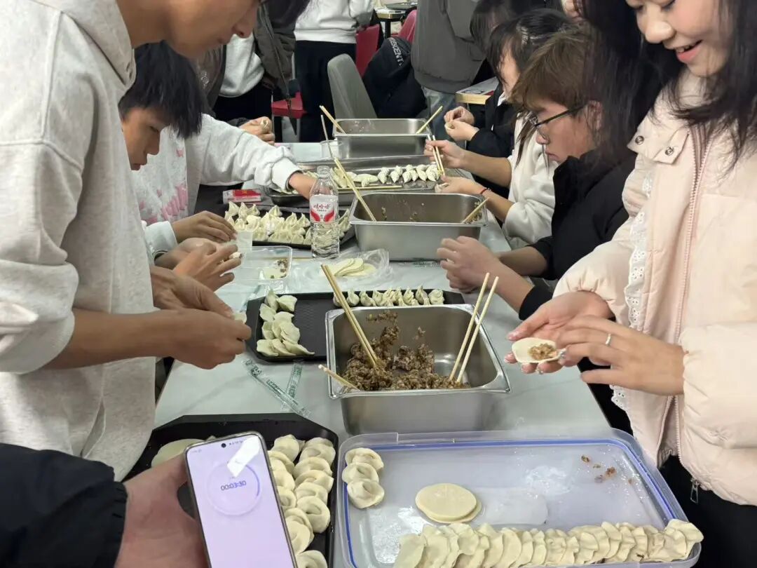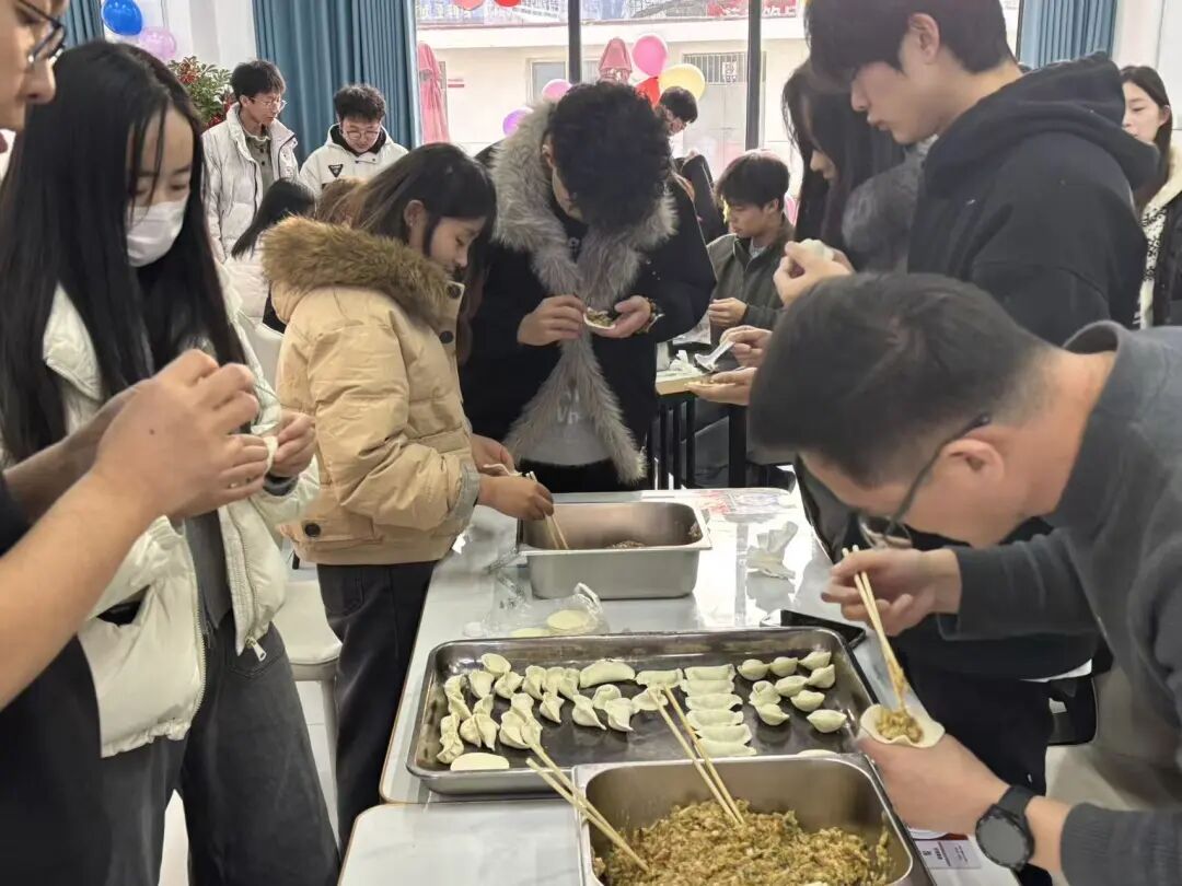 活动现场暖意融融,师生们参与包饺子、游戏互动、猜歌等趣味环节,在吃饺子环节中还观看了精彩绝伦的节目表演。