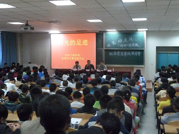 为进一步发挥优秀学生的激励作用,营造良好的学风,用身边的典型榜样教育影响广大青年学子,帮助大一新生尽快融入大学生活和学习中,9月16日下午,材料工程学院举行了“闪光的足迹”优秀大学生事迹报告会。学院党总支书记韩国才、副院长贾魁,学生政治辅导员郭峰、武明出席大会,2014级同学共计400余人参加大会。 报告团成员由学院国家奖学金、励志奖学金获得者、英语四级高分通过者、优秀学生干部等优秀大学生组成。会上,报告团成员结合自身成长成才的经验,与同学们交流了自己的学习心得与学习方法,为同学们展现了他们精彩而又充实的大学生活,和大家一起分享了他们对大学生活感悟和奋斗的历程。同时,报告团成员还就如何制定有效的学习计划、掌握正确的学习方法,优秀大学生应该具备的素质和大学的收获等问题与同学们进行了互动交流。 韩国才号召全体新同学要向高年级优秀同学学习,不断提高自身素质,树立正确的人生目标,积极努力,坚持不懈,争做一名全面发展的优秀大学生。