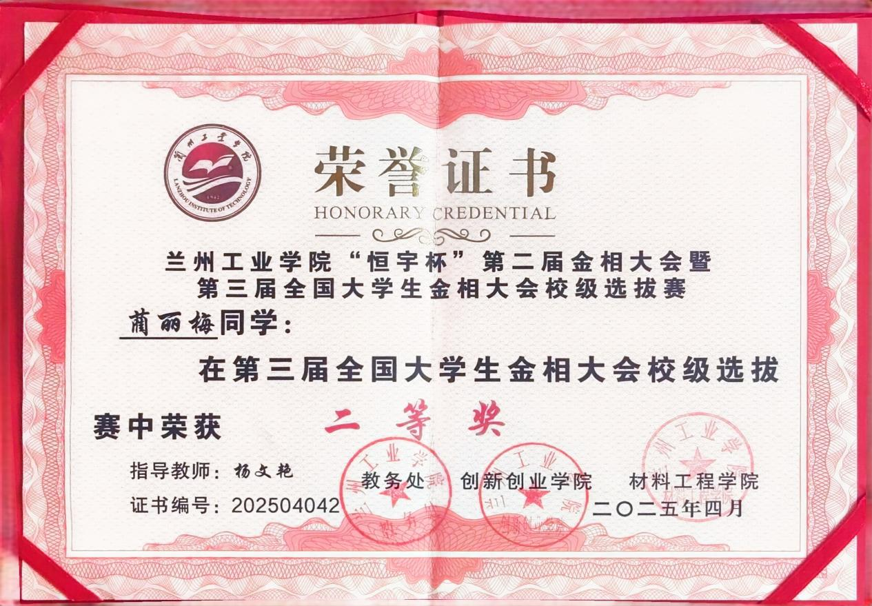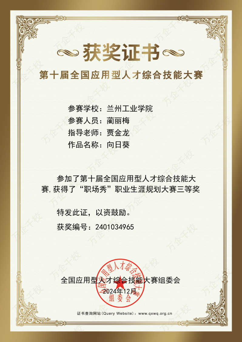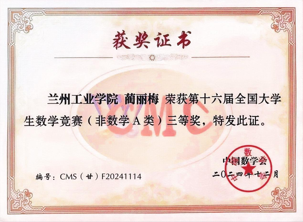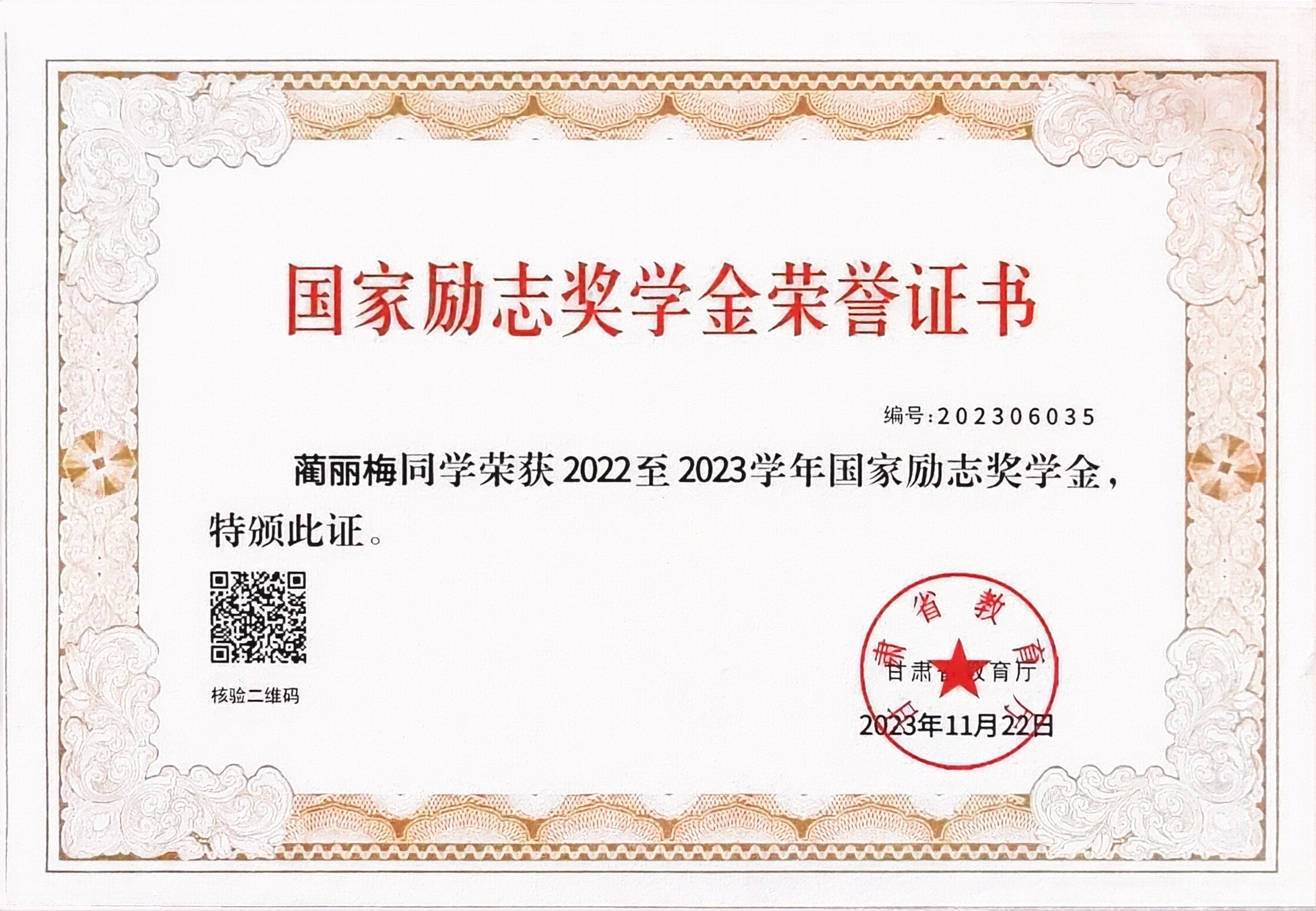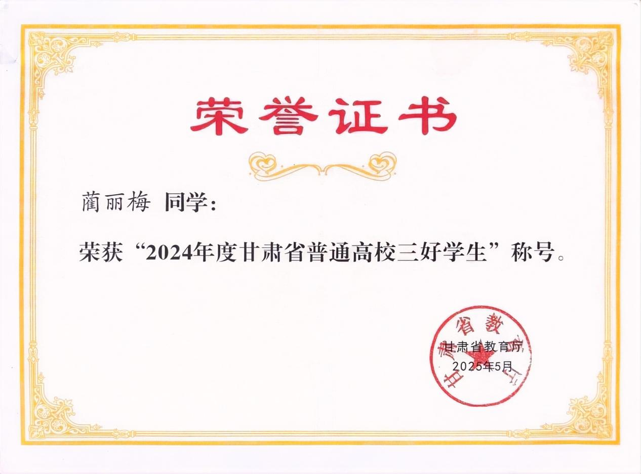 蔺丽梅:女,20岁,汉族,中共预备党员,甘肃省定西市人,材料工程学院材料成型及控制工程专业22级1班学生。荣获2023-2024学年国家奖学金、2022-2023学年国家励志奖学金、四级证书、2024中国创新方法大赛(甘肃赛区)二等奖、第十六届全国大学生数学竞赛(非数学A类)三等奖。被授予甘肃省“三好学生”、兰州工业学院“三好学生标兵”、“优秀共青团员”等称号。