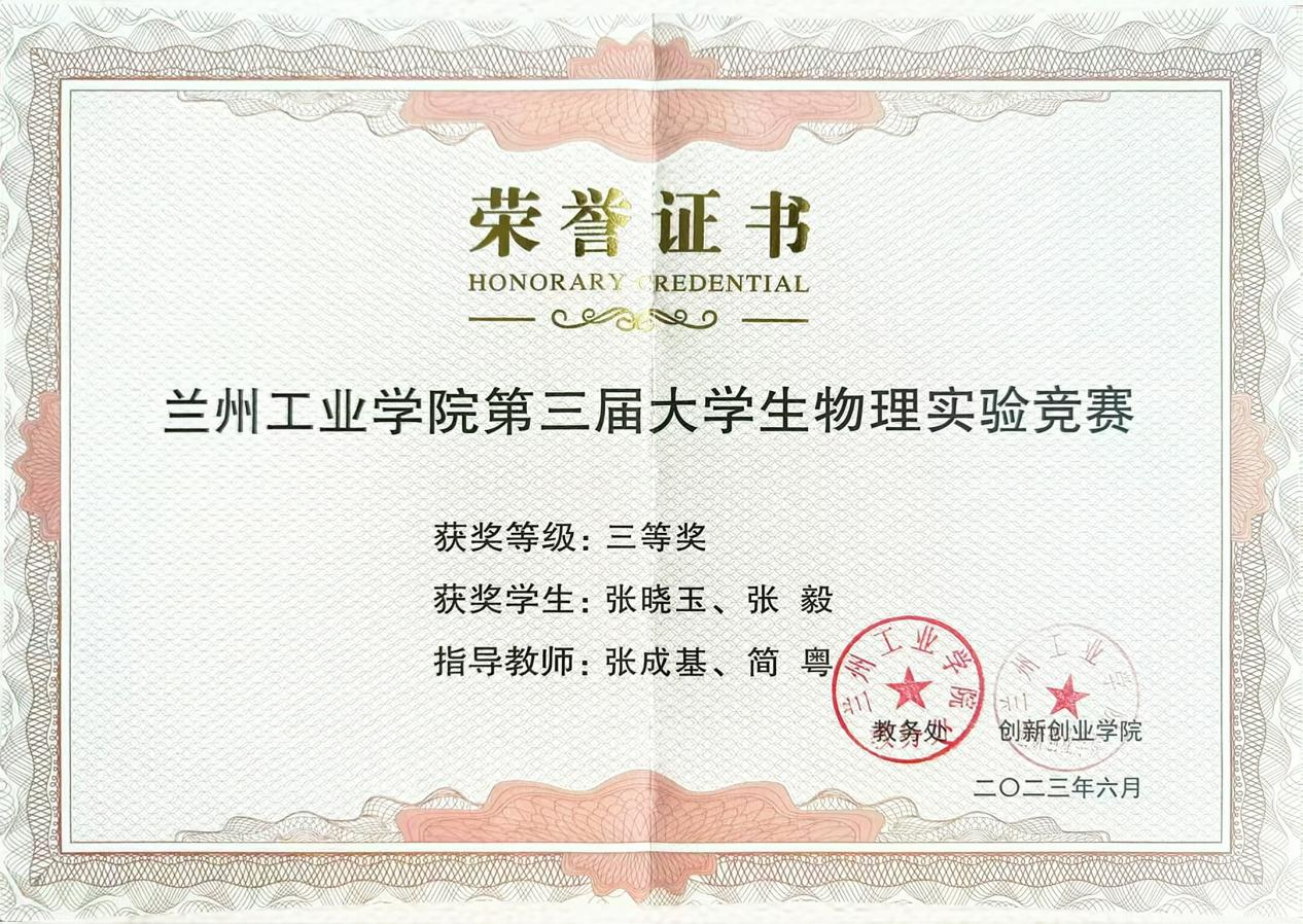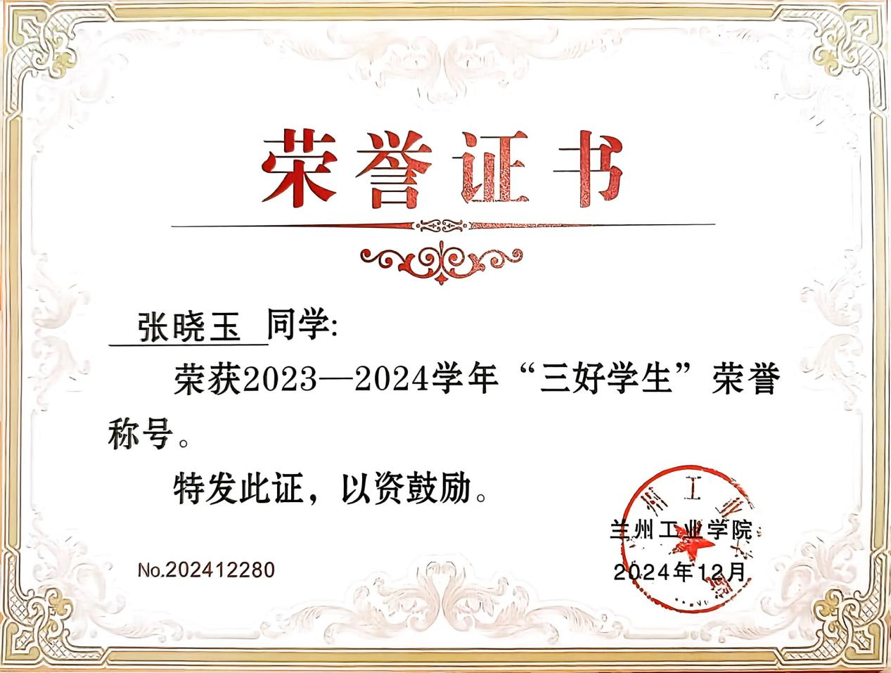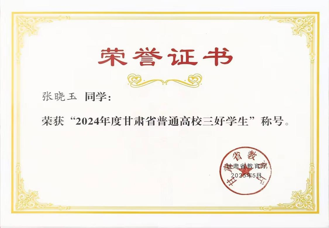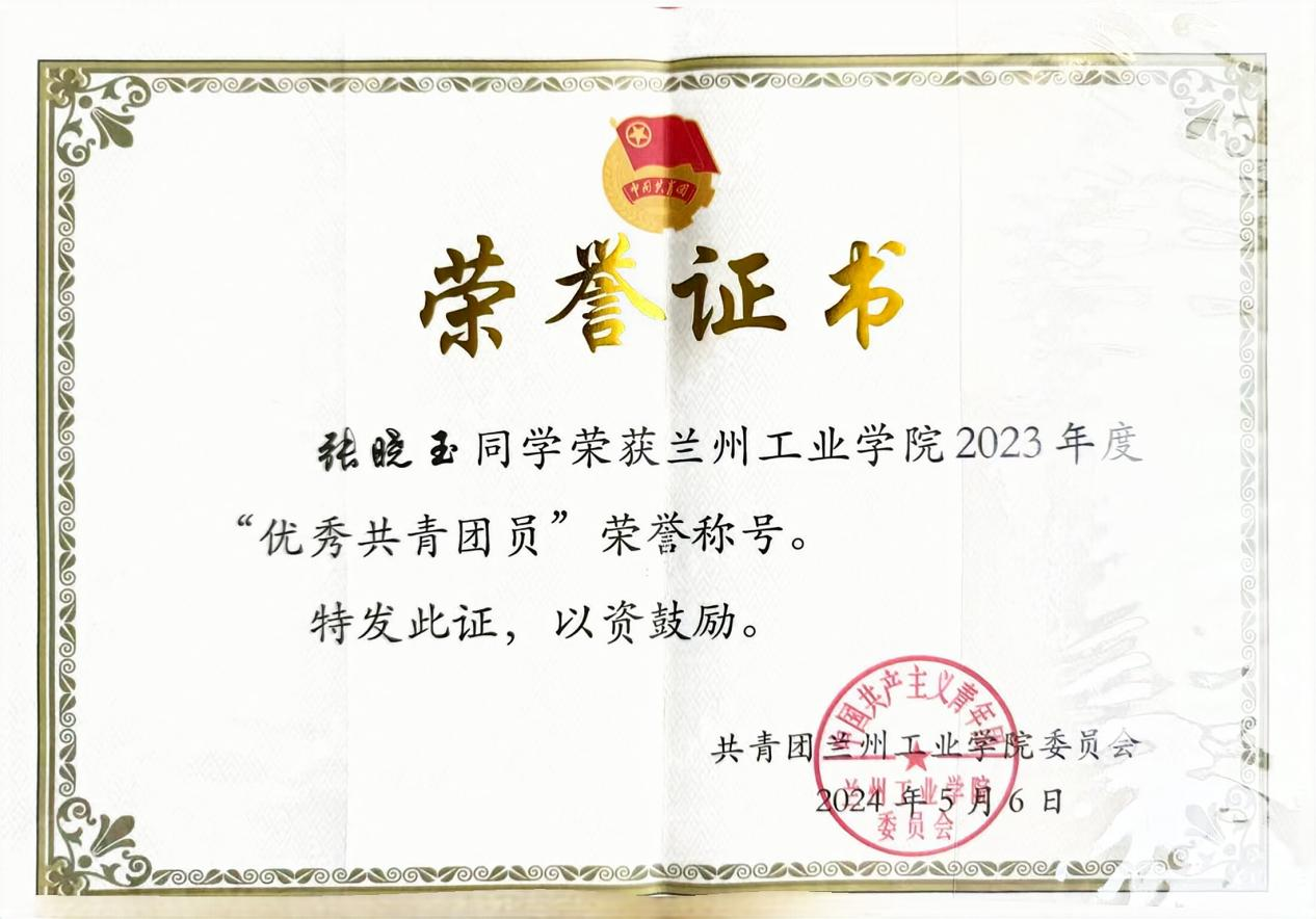 张晓玉:女,21岁,汉族,中共预备党员,山东省聊城人,材料工程学院材料成型及控制工程专业22级1班学生。荣获2023-2024学年国家奖学金、2022-2023学年国家励志奖学金、第十五届周培源力学竞赛国家级优秀奖、2024中国创新方法大赛(甘肃赛区)二等奖、大学生创新创业训练计划项目国家级立项一项。被授予“优秀大学生志愿者”、甘肃省“三好学生”、兰州工业学院“三好学生”、“优秀共青团员”等称号。持有计算机二级、TRIZ一级、红十字救护员等技能证书。