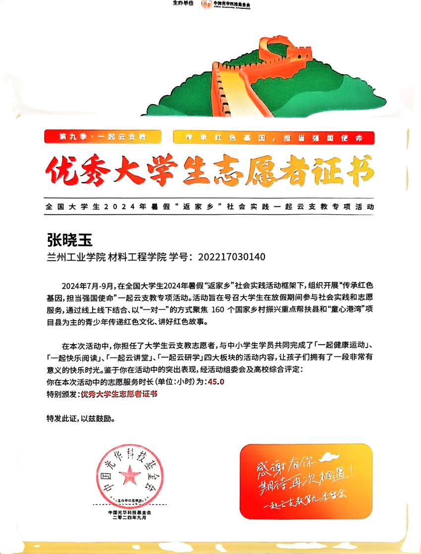 由于在各方面的出色表现,我曾获兰州工业学院“优秀共青团员”称号。利用假期时间,我参加了返家乡社会实践、一起云支教等活动。在返家乡社会实践中,我深入基层,了解家乡的发展现状与存在的问题,积极为家乡的发展建言献策。在云支教活动中,我为偏远地区的孩子们传授知识,拓宽他们的视野,希望帮助他们实现自己的梦想。通过这些活动,我获得了“优秀志愿者”称号。此外,我还一次性通过了红十字救护员证、普通话证、计算机二级、TRIZ一级合格证书等,努力做到德智体美劳全面发展。