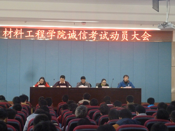 为加强学风建设,严肃考风考纪,2015年1月5日,材料工程学院在八楼会议中心召开诚信考试动员大会。学院党总支书记韩国才、副院长贾魁出席大会,辅导员郭峰、李娟娟、武明以及2013级、2014级600余名学生参加大会。 动员会上,郭峰就诚信考试的意义、学校考试相关管理规定、违纪处分案例等方面的内容进行了详细讲解;李娟娟宣读了《诚信考试倡议书》,参会的全体同学进行了诚信考试宣誓。 韩国才在动员大会上向全院同学提出三点希望,一是希望同学们诚信考试,并将诚信的风尚带到班级、寝室,在整个学院营造诚信考试氛围;二是希望同学们加强自我管理,在学习生活中诚实做人,弘扬社会主义核心价值观;三是希望同学们在考试前要做好认真而全面的复习,考出好成绩,为促进学校的学风建设尽自己的一份力量。 同时,大会传达了《材料工程学院做好2015年寒假期间学生安全教育及管理工作的通知》,并结合近期国家出现的一些安全事故,就交通、火灾、踩踏等安全事故的防范作了安排部署。 |