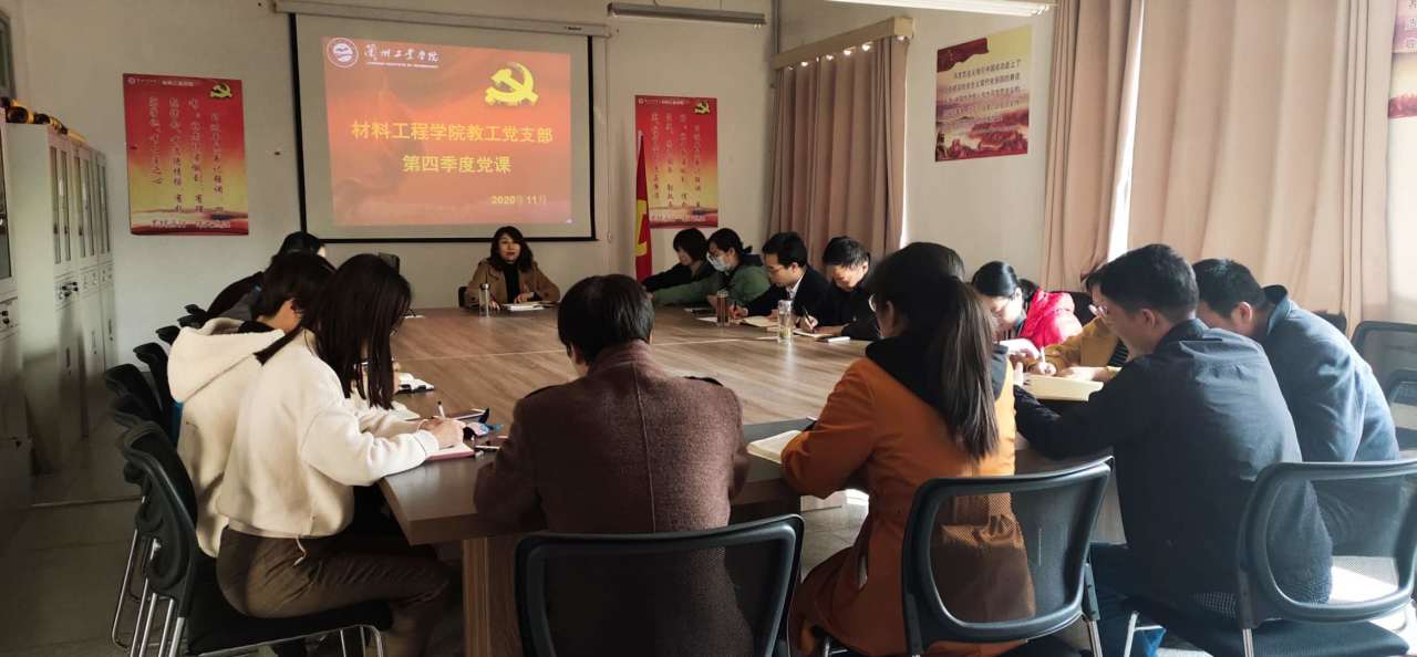 11月10日下午2:30,材料工程学院教工党支部在党员之家召开会议,集中学习中国共产党第十九届五中全会精神,学院全体教工党员参加会议。会上,党支部书记陈玉梅传达了党的十九届五中全会公报及校党委书记俞子泓、校长王华栋在学校召开的中层干部大会上的重要讲话精神,全体教工党员集中在线观看了学习贯彻党的十九届五中全会精神中央宣讲团首场报告会内容。