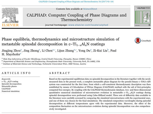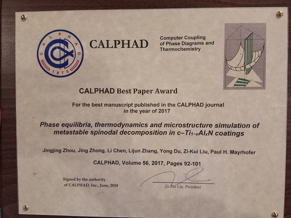 2018年5月31日,在墨西哥克雷塔罗州举办的第47届相图及热化学计算耦合国际会议(CALPHAD XLVII)公布了2017年度《CALPHAD》最佳论文奖,我校材料工程学院周晶晶博士发表的题为“Phase equiliria, thermodynamics and microstructure simulation of metastable spinodal decomposition in c-Ti1-xAlxN coatings”的学术论文荣获该奖项,并获得1000美元奖金。 《CALPHAD》杂志是材料热、动力学及材料设计领域的国际权威杂志(SCI收录,JCR2区),每年从近千名专家学者的论文中评选出1篇最佳论文。周晶晶博士的工作采用CALPHAD方法首次构建了亚稳c-TiAlN基涂层的热力学数据库,并在此基础上通过Cahn-Hilliard模型对其调幅分解的微结构演化进行定量描述,为成分设计、工艺优化以及更高性能涂层开发提供重要的理论依据。 |